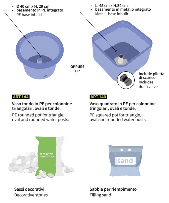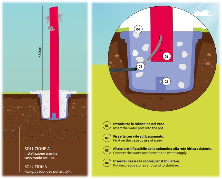 - fuori terra: in questo caso il vaso verrà posizionato a livello del suolo e si dovrà utilizzare il foro di scarico inferiore per il drenaggio dell'acqua;