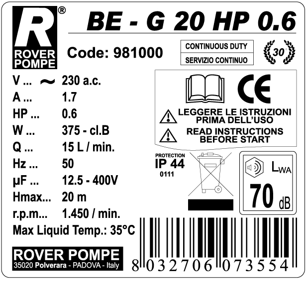 Pompa autoaspirante BISENSO ad anello liquido laterale, con girante a geometria stellare. Questo particolare tipo di scoperta idraulica le conferisce una straordinaria capacità autoaspirante anche in presenza di una discontinua disponibilita?di liquido in aspirazione (presenza di aria o altri gas ). E' indicata per il travaso delicato di liquidi filtrati in AGRICOLTURA, ENOLOGIA, NAUTICA e GIARDINAGGIO. I liquidi da travasare devono essere neutri e puliti, oppure contenere una percentuale di solidi (0,2- 0,5% max) aventi caratteristiche di durezza e granulometria tali da non usurare le superfici interne di rasamento della pompa. Nei casi estremi può essere utile un filtro a maglie strette montato sulla tubazione di aspirazione. Esempi di liquidi sono: ACQUA, VINO, LATTE, MOSTO, DETERGENTI LIQUIDI, GASOLIO, OLIO, GLICOLE Marchi di sicurezza: CE + IMQ ed è dotata di protezione termica Caratteristiche: autoadescante bisenso con base per il fissaggio maniglia per il trasporto pompa e girante in bronzo albero in acciaio inox aisi 304 motore in ghisa Dati tecnici: - Motore monofase - Senso di rotazione destro/sinistro, - Raccordi in ottone - Tensione 230 Volt - Hp: 0,6 - Potenza 420 W - N giri/min. 1450 - Litri/h: 2400 - Altezza max (m): 12 - Raccordo diam. mm. 25 - Peso 6 kg Certificazione IMQ