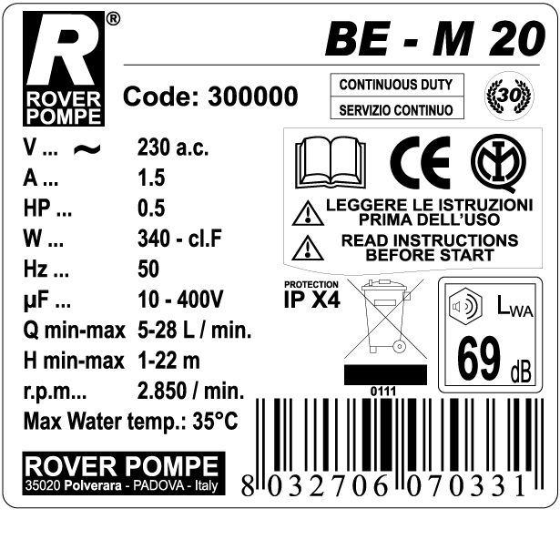 Pompa autoaspirante BISENSO ad anello liquido laterale, con girante a geometria stellare.Questo particolare tipo di scoperta idraulica le conferisce una straordinaria capacità autoaspirante anche in presenza di una discontinua disponibilità di liquido in aspirazione (presenza di aria o altri gas ). E' esclusivamente indicata per il travaso di liquidi filtrati per : AGRICOLTURA, ENOLOGIA, NAUTICA,GIARDINAGGIO. I liquidi da travasare devono essere neutri e puliti, oppure contenere una percentuale di solidi (0,2- 0,5% max) aventi caratteristiche di durezza e granulometria tali da non usurare le superfici interne di rasamento della pompa. Nei casi estremi può essere utile un filtro a maglie strette montato sulla tubazione di aspirazione. La tecnologia NOVAX applicata sulle elettropompe Rover è sinonimo di maggiore affidabilità e durata; i liquidi alimentari vengono travasati con maggiore sicurezza, grazie al particolare materiale inossidabile del quale è costituito il gruppo pompa. Caratteristiche principali: PORTATA: 1700 lt/h DIAM. MM: 20mm HP/W: 0.5 HP / 340W PREVALENZA MAX H/Mt: 25 mt R.P.M.: 2850