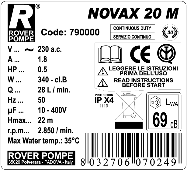 Pompa autoaspirante BISENSO ad anello liquido laterale, con girante a geometria stellare.Questo particolare tipo di scoperta idraulica le conferisce una straordinaria capacità autoaspirante anche in presenza di una discontinua disponibilità di liquido in aspirazione (presenza di aria o altri gas ). E' esclusivamente indicata per il travaso di liquidi filtrati per : AGRICOLTURA, ENOLOGIA, NAUTICA,GIARDINAGGIO. I liquidi da travasare devono essere neutri e puliti, oppure contenere una percentuale di solidi (0,2- 0,5% max) aventi caratteristiche di durezza e granulometria tali da non usurare le superfici interne di rasamento della pompa. Nei casi estremi può essere utile un filtro a maglie strette montato sulla tubazione di aspirazione. La tecnologia NOVAX applicata sulle elettropompe Rover è sinonimo di maggiore affidabilità e durata; i liquidi alimentari vengono travasati con maggiore sicurezza, grazie al particolare materiale inossidabile del quale è costituito il gruppo pompa. Caratteristiche principali: PORTATA: 1700 lt/h DIAM. MM: 20mm HP/W: 0.5 HP / 340W PREVALENZA MAX H/Mt: 25 mt R.P.M.: 2850