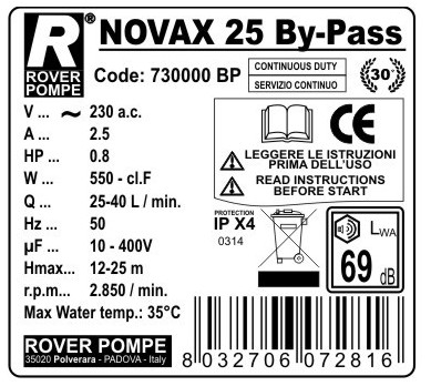 Pompa autoaspirante BISENSO ad anello liquido laterale, con girante a geometria stellare.Questo particolare tipo di scoperta idraulica le conferisce una straordinaria capacità autoaspirante anche in presenza di una discontinua disponibilità di liquido in aspirazione (presenza di aria o altri gas ). E' esclusivamente indicata per il travaso di liquidi filtrati per : AGRICOLTURA, ENOLOGIA, NAUTICA,GIARDINAGGIO. I liquidi da travasare devono essere neutri e puliti, oppure contenere una percentuale di solidi (0,2- 0,5% max) aventi caratteristiche di durezza e granulometria tali da non usurare le superfici interne di rasamento della pompa. Nei casi estremi può essere utile un filtro a maglie strette montato sulla tubazione di aspirazione. La tecnologia NOVAX applicata sulle elettropompe Rover è sinonimo di maggiore affidabilità e durata; i liquidi alimentari vengono travasati con maggiore sicurezza, grazie al particolare materiale inossidabile del quale è costituito il gruppo pompa. Caratteristiche principali: PORTATA: 1700 lt/h DIAM. MM: 20mm HP/W: 0.5 HP / 340W PREVALENZA MAX H/Mt: 25 mt R.P.M.: 2850