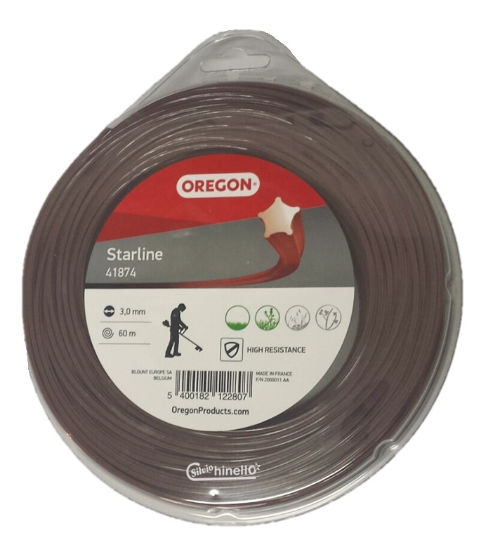 Filo per decespugliatore professionale Oregon linea Starline in nylon, diam. 3mm. Questo filo a sezione stellare (a 5 punte) garantisce alta resistenza ed offre prestazioni di taglio elevate. Grazie alle 5 punte, il taglio è netto ed evita l'ingiallimento dei fili d'erba. E' pensato per l'utilizzo professionale su erba di giardini e prati (NON adatto per rovi e sterpaglie). Disponibile in: Dispenser da 60 metri (colore marrone)