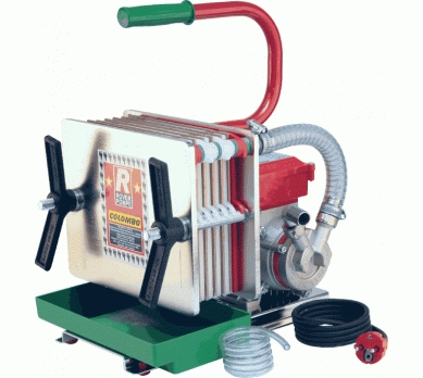 ll FILTRO COLOMBO® è costituito dalla speciale elettropompa e da un sistema filtrante denominato sistema liquido a strati pressati. Questo particolare tipo di filtraggio permette di ottenere ottimi livelli di purificazione delle bevande senza alterare le caratteristiche fondamentali del liquido travasato; per questo è particolarmente apprezzato per filtraggi domestici; ovunque sia necessario filtrare una bevanda per poterla servire o imbottigliare perfettamente limpida e senza traccia alcuna di residui poco graditi. Il FILTRO COLOMBO® è stato pensato per filtrare soprattutto bevande, per cui tutti i materiali utilizzati sono perfettamente compatibili con liquidi alimentari. È particolarmente indicato per filtrare vino, acqua, infusi, birre, soluzioni farmaceutiche, profumi. Non richiede alcuna manutenzione particolare se non una normale pulizia. Caratteristiche tecniche: - STRATI FILTRANTI:Sei - PRODUZIONE: 250 l/h - DOTAZIONE: Inclusi n. 6 cartoni filtranti gr. 4 e n. 6 cartoni filtranti gr. 16 - PESO GRUPPO COMPLETO: 17 Kg - DIMENSIONI: 36x30x28h cm - Corpo pompa in bronzo purissimo di prima qualità. - La pompa è del tipo "autoadescante", realizzata specificamente per il funzionamento di questo filtro enologico. - Motore elettrico lunga durata potenza 0,5 HP - Ideale per uso domestico NB: IL TUBO DI MANDATA E ASPIRAZIONE NON E' IN DOTAZIONE (OPTIONAL)