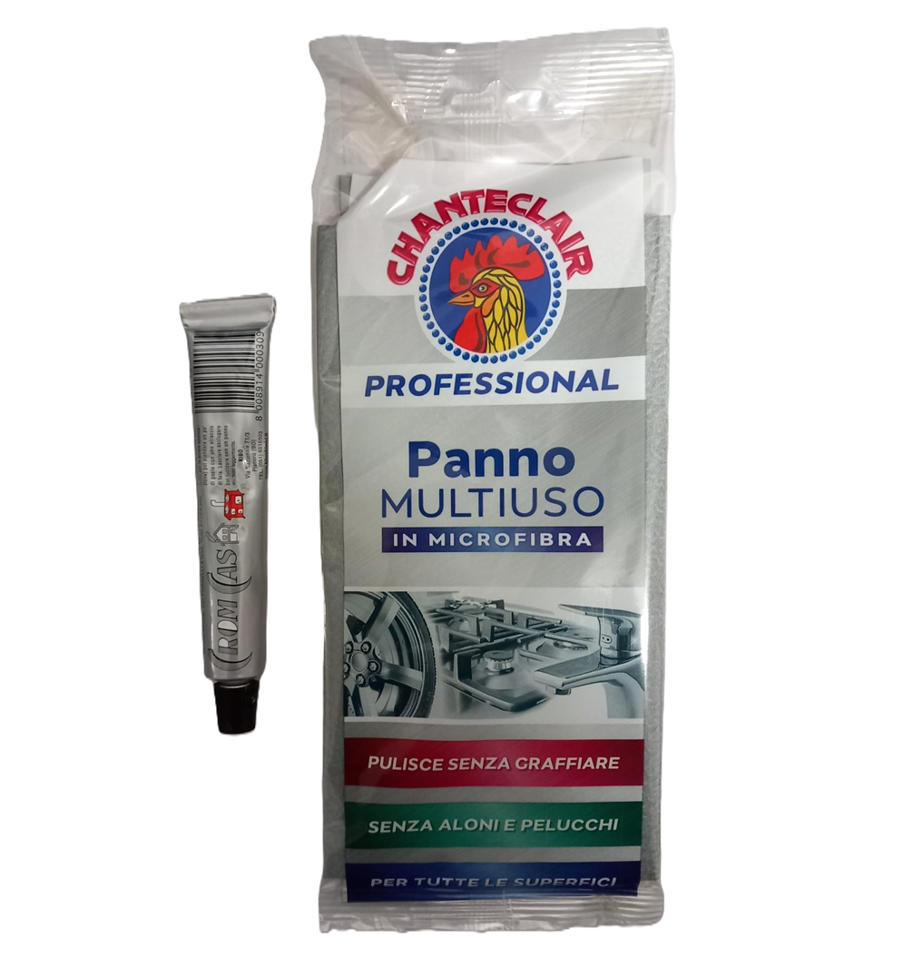 Kit composto da: - Pasta CromCasa, antiruggine per metalli, in formato da 25ml: rende brillante la piastra delle cucine economiche, i fornelli a gas, i tubi della stufa, ecc. Colore cromo/argento. - Panno multiuso professionale Chanteclair in microfibra: pulisce senza graffiare, non lascia aloni e pelucchi, è idoneo per tutte le superfici.