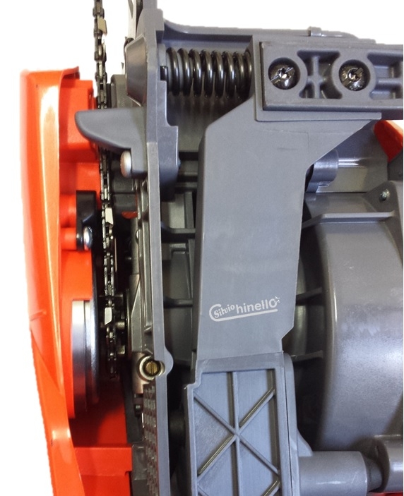 - tendicatena laterale: permette una comoda regolazione della lunghezza e della tensione della catena sulla barra;