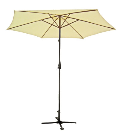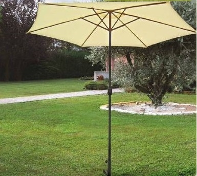 Ombrellone a palo centrale in alluminio mod. Adra Telaio in alluminio Struttura colore grigio con palo sezione tonda Ø 38mm 8 stecche in alluminio 12x18 mm Azionamento d'apertura a manovella e carrucola Copertura in poliestere 180 gr., colore beige Senza base Dimensione 300cm