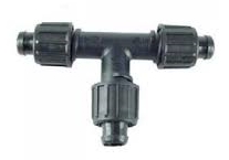 Raccordo a T per tubo gocciolante con n. 3 portagomma maschio da 16mm provvisti di girelli, specifico per la corretta installazione della manichetta gocciolante.