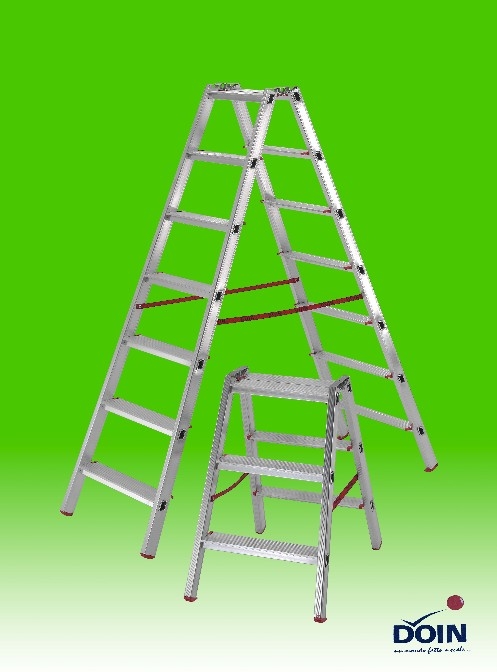 La scala Doin in alluminio a doppia salita mod. Luna, è ideale per essere usata come scala tradizionale nelle misure più alte o come sgabello nelle basse misure, in quanto dotata anche di seduta di lavoro e di cinghia antiapertura.