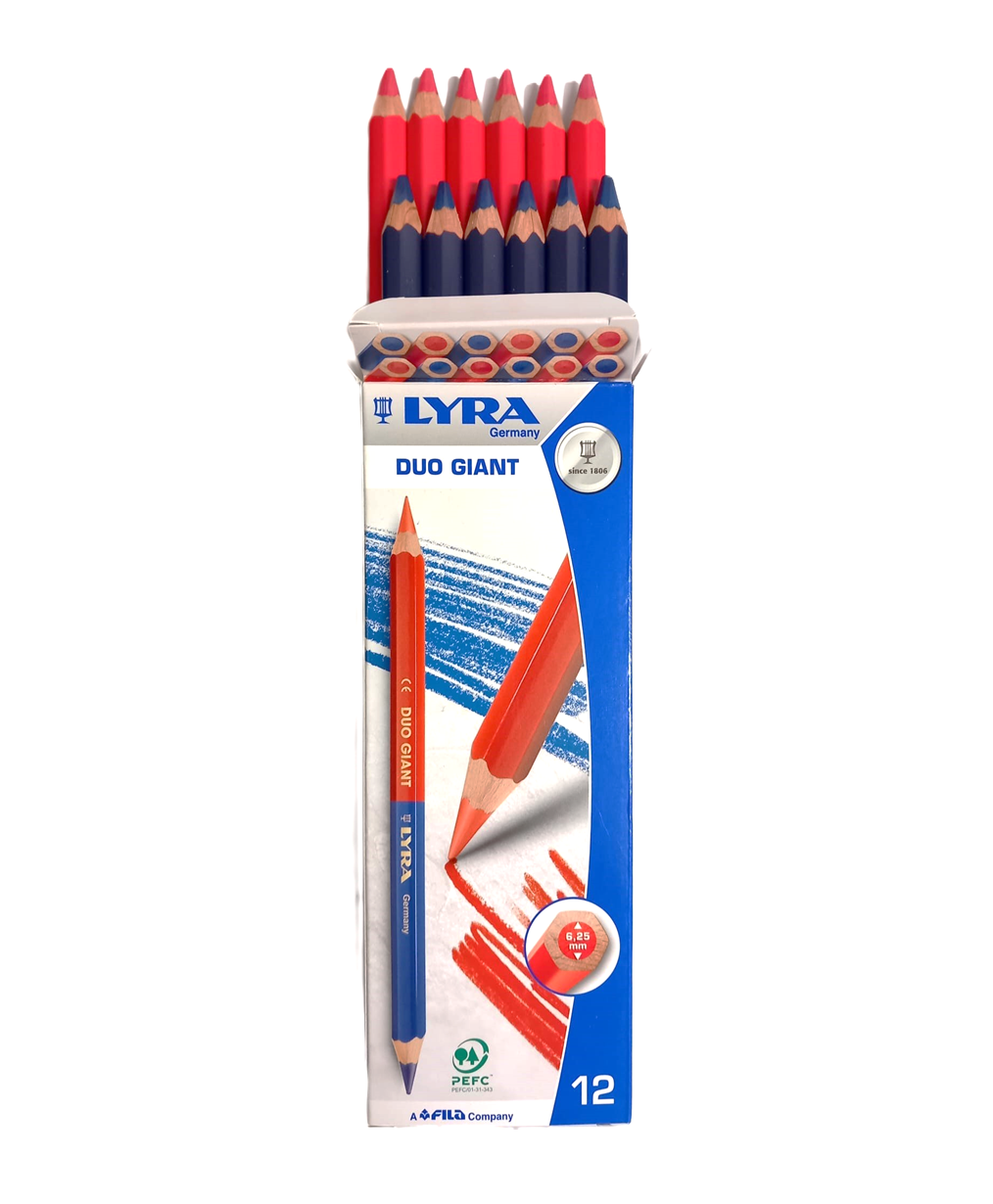 Il maxipastellone Lyra DuoGiant di colore rosso e blu, ha entrambe le estremità appuntite. Idonea per correzioni (blu/rosso) per l'installazione di acqua calda/fredda. Adatto per la marcatura su legno asciutto o bagnato, metallo, pietra, calcestruzzo, plastica, cartone. Costituite in legno da foreste sostenibili, norma PEFC e FSC Forma esagonale, mina di grosso spessore (6.25mm) La confezione comprende: 12 matite