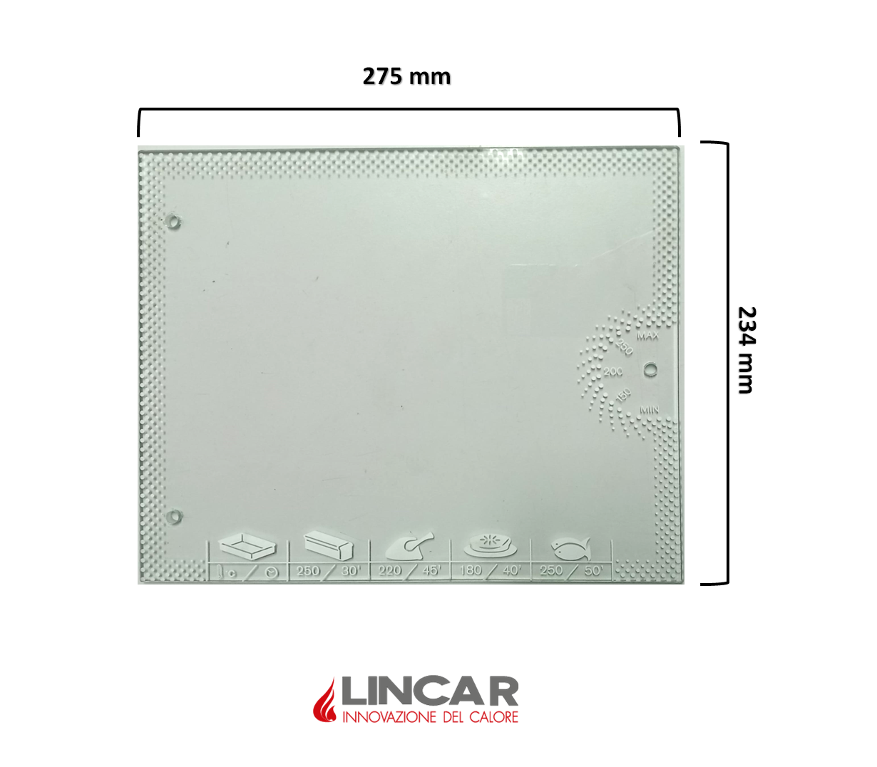 Ricambio originale Lincar. Vetro ceramico porta fuoco per stufe a legna del marchio, tra cui: - Monellina Misure: 250 x 269 mm - sp. 4 mm (angoli superiori smussati)
